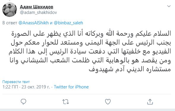 "Мир вам и да пребудет над вами милость Аллаха и его благословение! - написал советник Кадырова ваххабитам. - Я тот, который показан на [обсуждаемом вами] видео, стою справа от главы Чечни. Я готов обсудить с вами это видео и то, что ему предшествовало. Рассказать, что подтолкнуло господина президента к таким словам. То, что он имеет в виду - это ваххабиты, которые притесняли чеченский народ. Я его религиозный советник Адам Шахидов".