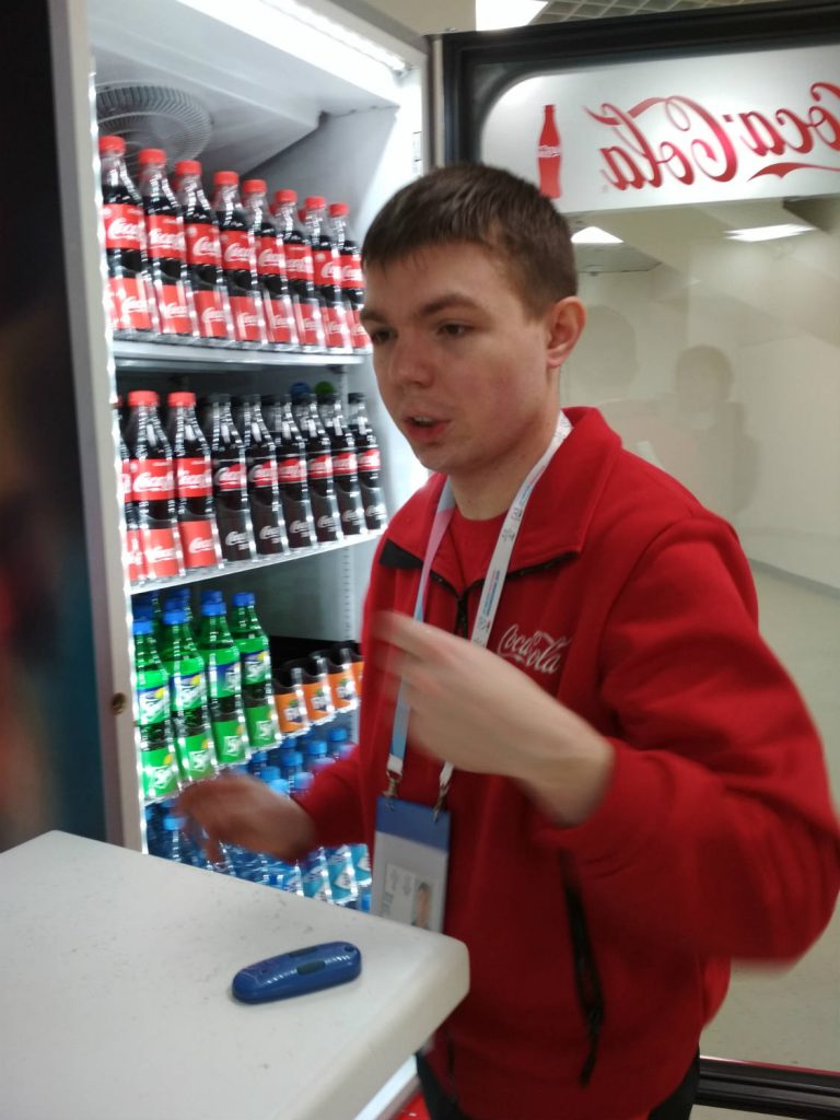 Дима за работойФото: из личного архива Ирины Барановой «Я перед началом объяснила всем, что с нашими нужно общаться как с обычными двадцатилетними парнями. Буквально через два-три дня все привыкли и уже не обращали внимания на какие-то нюансы, — рассказывает Ирина Баранова, мама Димы. — Там был старший менеджер Coca-Cola, который, глядя на работу ребят, без всякого снисхождения сказал, что взял бы таких мерчендайзерами охотно. Они справлялись с раскладкой лучше всех — четко, быстро, как по линеечке, этикетка к этикетке. Дима пошел бы работать хоть завтра в любой магазин. Эта работа для них идеальна. Людям с РАС важен алгоритм, будь то уравнение, таблица Менделеева или раскладка бутылок — неважно, они будут это делать добросовестно, четко и без напоминаний. Наши были счастливы. Они и так обделены общением, а здесь чувствовали, что участвуют в событии такого масштаба! Носили всю зиму эти куртки. Получили зарплату. Это было огромное дело для нас всех».