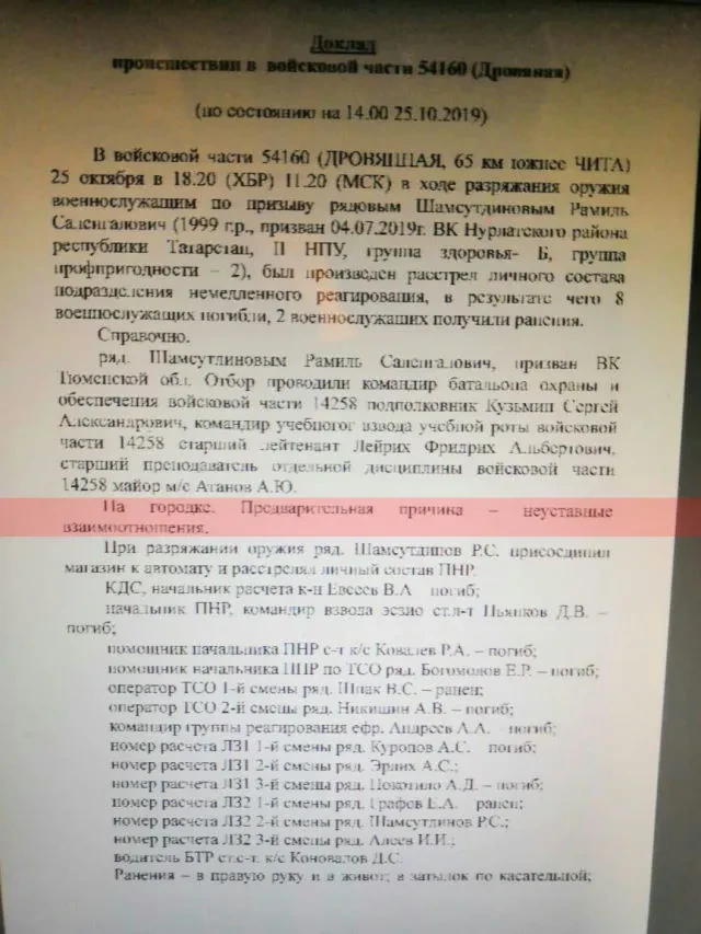 25 октября в 18 часов 20 минут в поселке Горный, расположенном в 65 км от Читы, на территории войсковой части № 54160 20-летний солдат-срочник Рамиль Шамсутдинов расстрелял своих сослуживцев. Стрелял в караульных прицельно: в голову и поверх бронежилетов, которые были на военнослужащих подразделения немедленного реагировании (ПНР). Два офицера, два контрактника и четверо солдат-срочников погибли, еще двое с тяжелыми ранениями доставлены в госпиталь.