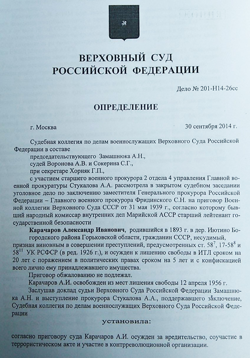 Однако в деле юных террористов случился неожиданный сбой репрессивной машины. В судебном заседании многие подростки были оправданы, а в отношении самой Черновой было вынесено частное определение. Однако на помощь следователю-садистке пришел ее начальник Карачаров. Он не только не наказал Чернову за её преступления, но даже не выпустил подростков из пыточных подвалов. Вместо этого он дал указание направить уголовное дело на рассмотрение "особой тройки" НКВД, где сам же и председательствовал. "Тройка" вынесла смертные приговоры, дети были расстреляны, а их тела сброшены в безвестные ямы. Так закончилось марийское "дело подростков" сталинского времени. Имена репрессированных несовершеннолетних скрыты в архивах ФСБ, и мы узнали об их судьбе только благодаря определению Судебной коллегии по делам военнослужащих Верховного суда Российской Федерации, которая 30 сентября 2014 года в закрытом судебном заседании рассматривала заявление Александра Бусарова. Уголовное дело Карачарова, арестованного в 1939 году во время бериевской чистки органов госбезопасности и получившего относительно мягкий приговор – 20 лет лагерей, – в архиве ФСБ имеет гриф "совершенно секретно". Грифы секретности получили также и материалы надзорного производства военной прокуратуры по делу Карачарова, и материалы судебного рассмотрения дела.