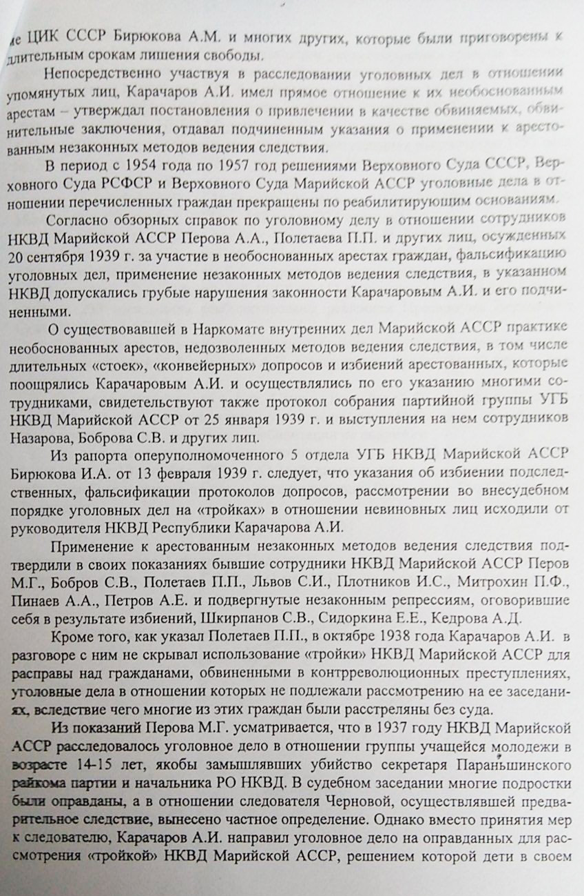 "За период с августа 1937 года по октябрь 1938 года "тройкой" НКВД Марийской ССР под председательством Карачарова по обвинению в контрреволюционных преступлениях рассмотрено 1293 дела на 2415 лиц, из которых 1163 расстреляно. Рассмотрение следственных дел "тройкой" проводилось в массовом порядке: за 8 октября 1937 года – 166 дел на 230 человек, 11 октября 1937 года – 71 дело на 106 человек, 10 ноября 1937 года – 63 дела на 152 человека, 29 декабря 1937 года – 159 дел на 224 человека", – говорится в документе, который мы публикуем впервые. Под председательством чекиста Карачарова работал настоящий конвейер смерти, сожравший и его товарищей по "особой тройке" НКВД.