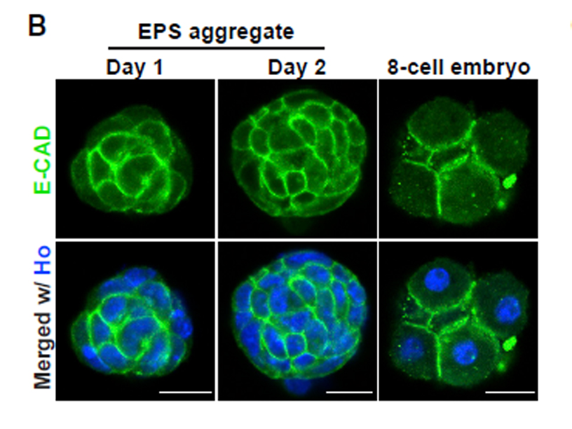 В нынешней работе удалось продвинуться дальше благодаря использованию так называемых «расширенных плюрипотентных стволовых клеток» (extended pluripotent stem cells, EPS-клетки). Если обычные стволовые клетки, взятые у эмбриона, могут дать начало разным типам эмбриональных клеток, но не могут дифференцироваться в клетки трофобласта, то эти клетки способны переходить как в клетки эмбриобласта, так и в клетки трофобласта. Чтобы наделить их такой способностью, на клетки во время культивирования воздействуют рядом веществ. Научились создавать EPS-клетки мышей в 2017 году.