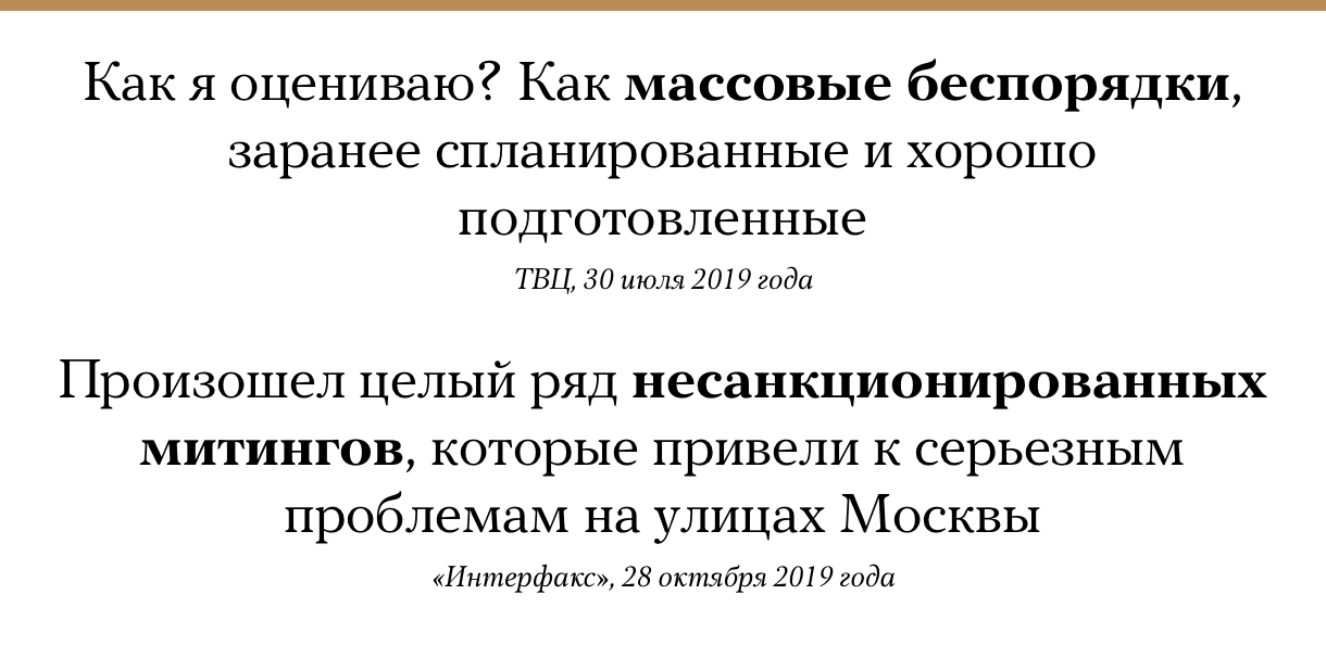 На совещании по профилактике правонарушений мэр Москвы Сергей Собянин высказался о массовых акциях летом 2019 года. Это второй раз за все время с начала акций в июле, когда глава города упоминал их в своих выступлениях. Если в июле Собянин стал первым чиновником, объявившим эти акции массовыми беспорядками (сразу после его слов СК возбудил соответствующее уголовное дело), то теперь мэр называет случившееся несанкционированными митингами. Правоохранительные органы, по словам Собянина, не допустили беспорядков, несмотря на то, что организаторы акций «хотели эскалировать эти события и довести их до критической черты». «Медуза» подробно разбирала ложные утверждения, сделанные мэром в июльском обращении сразу после первой массовой несогласованной акции 27 июля.