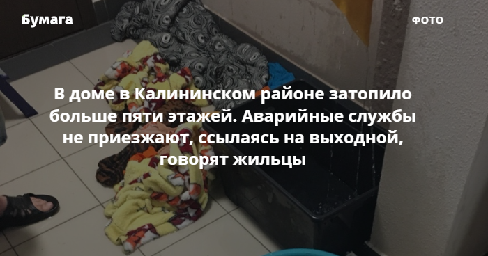 Жильцы утверждают, что аварийные службы отказались приезжать к ним, сославшись на выходной. По их словам, они звонили в МЧС, управляющую компанию и застройщику.