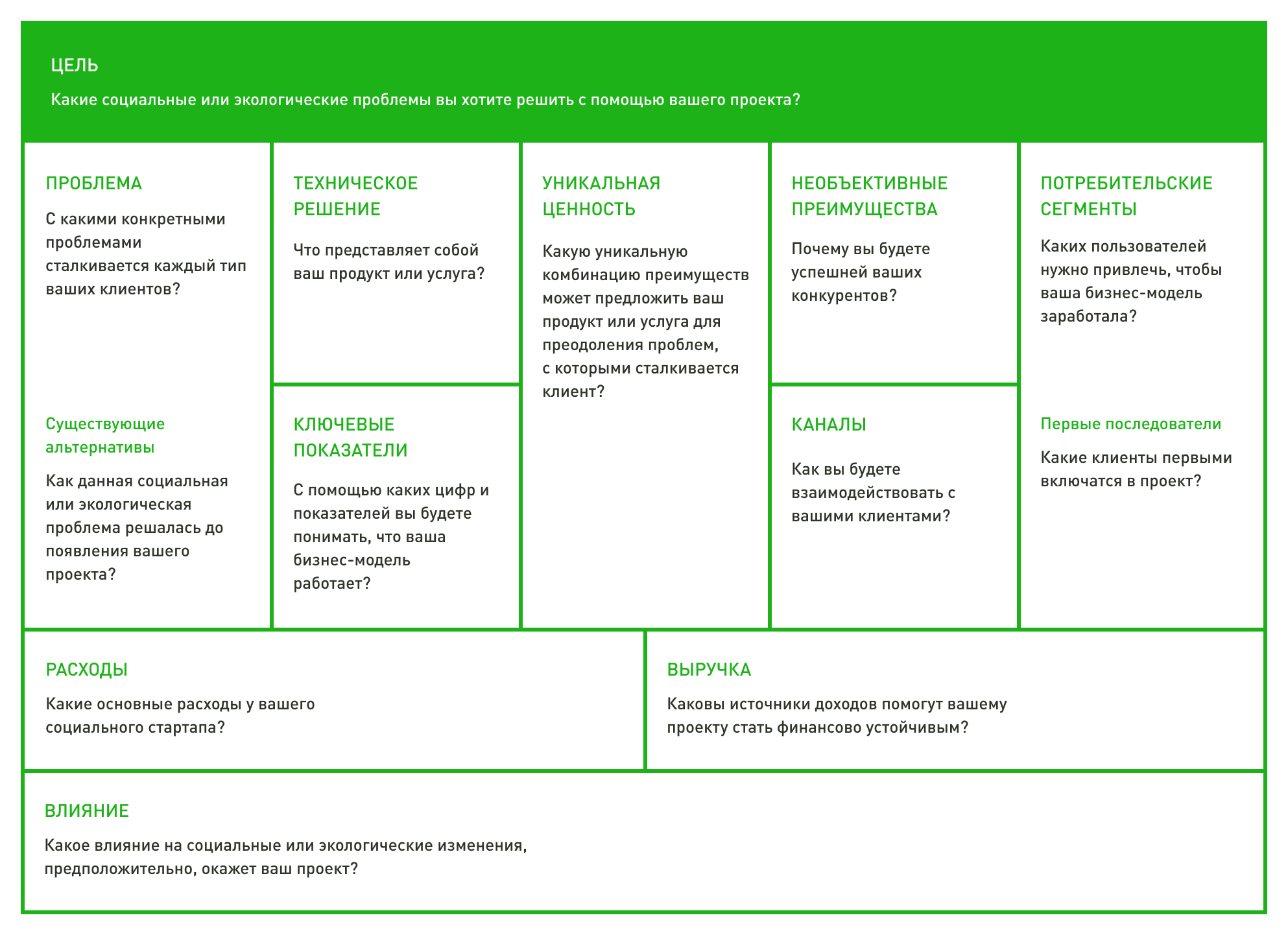 При составлении бизнес-модели социального стартапа можно ориентироваться на шаблон Social Lean Canvas.