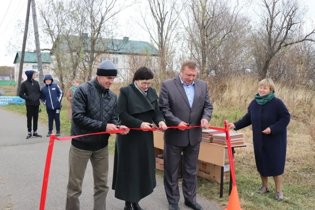 На открытие асфальтового отрезка пешеходной дорожки протяженностью меньше километра в селе Новоникольское Мичуринского района Тамбовской области приехали глава Мичуринского района, председатель районного Совета народных депутатов, сотрудники сельсовета и местные жители (почему-то в манишках «Единой России»).