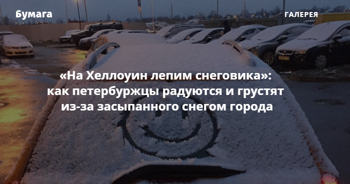 В ночь на 29 октября в Петербурге прошел сильный снегопад, а на улицах появились небольшие сугробы. Петербуржцы поздравляют друг друга с Новым годом, думают как праздновать при такой погоде Хеллоуин и грустят, что теперь придется чистить машину от снега.