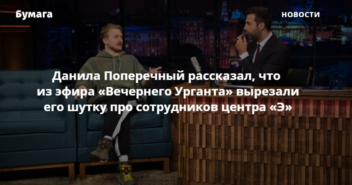 На ютьюб-канале шоу «Вечерний Ургант», которое показывают на Первом канале, вышел выпуск с петербургским блогером Данилой Поперечным. Как заявил комик в твиттере, из эфира вырезали его шутку о сотрудниках центра противодействия экстремизму ГУ МВД (Центра «Э»), которую он рассказал в самом начале.