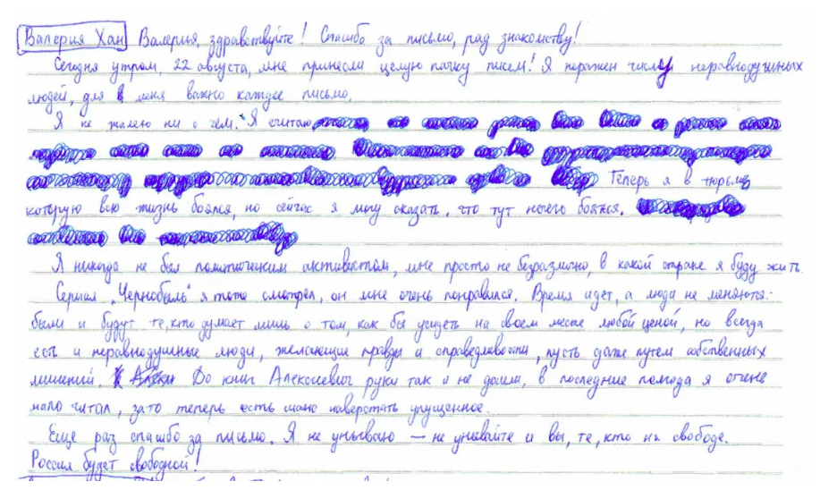 «Приятно было получать письма, из которых понятно, что я нахожусь в СИЗО не зря, – говорит Алексей Миняйло. – Отвечая на письма, для меня важно было помогать людям. Если знал, что письмо опубликуют, тщательно продумывал, что сказать. Текст может быть примером того, как человек в трудных обстоятельствах может не терять обладание духа и продолжать светить даже из тюремных стен».