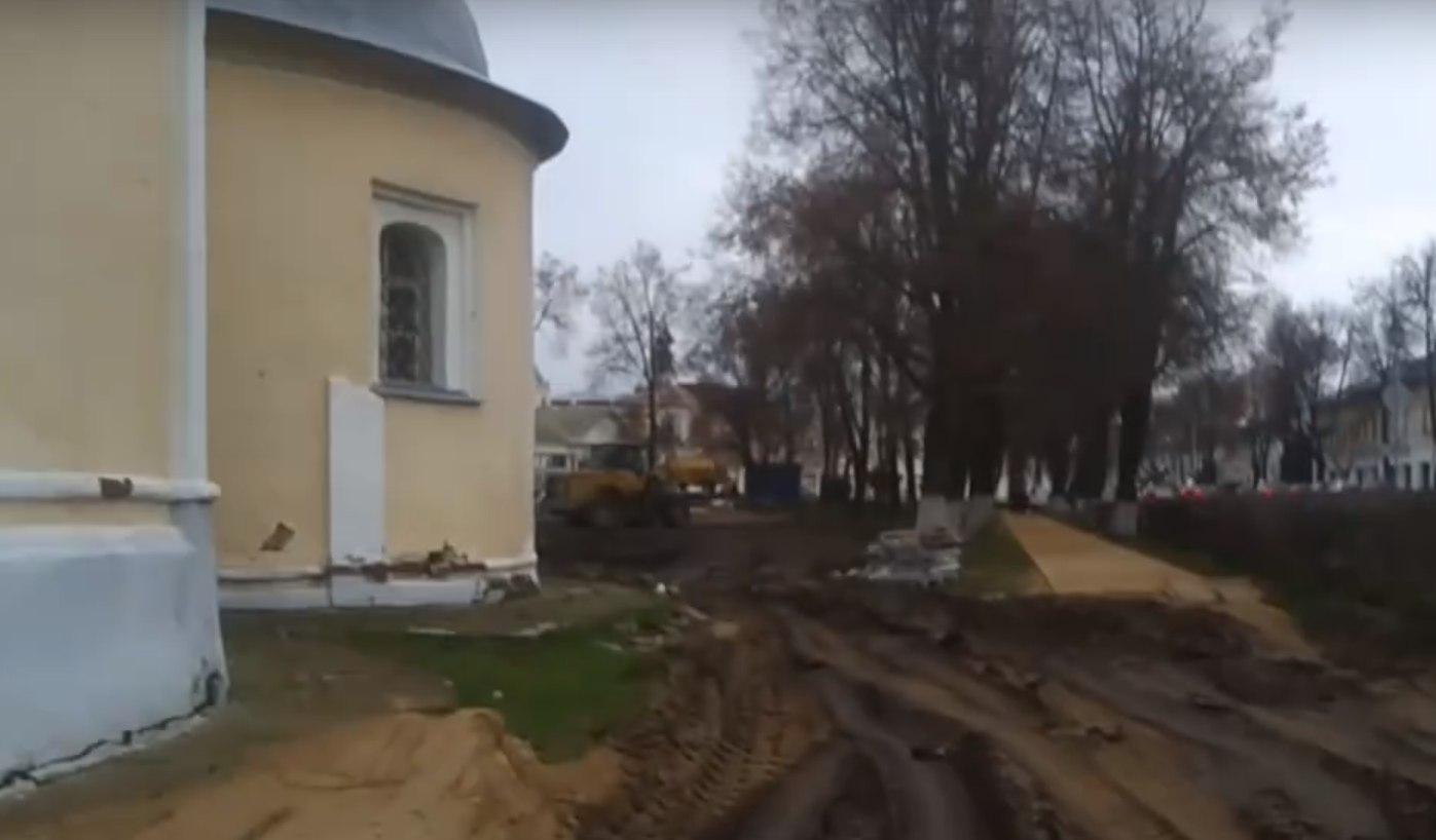 Несколько дней назад в группе “Чистый Суздаль” ВКонтакте появилось видео, в котором активист показывает и рассказывает о состоянии Торговых рядов, расположенных в центре Суздаля. В качестве характерных разрушений он выделяет провал плитки, под которой расположены подвалы; разрушение колонн и трещины в арках рядов. Также, помимо разрушения Торговых рядов, из-за работы техники происходит и разрушение брусчатки. По его предположению, эти разрушения непосредственно связаны с работой тяжёлой техники.