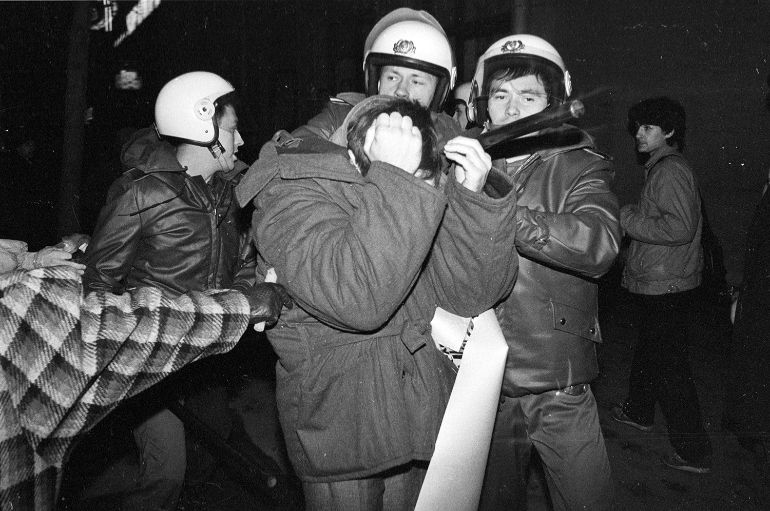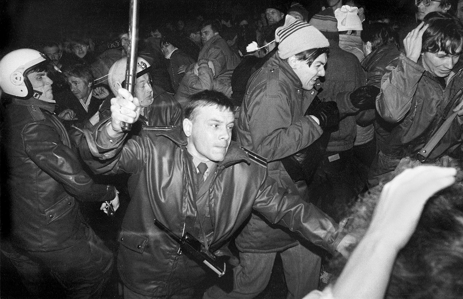 Шеренга спецназа в шлемах срывается с места и с разбега врубается в толпу мирных демонстрантов. Рубят дубинками налево и направо — бьют по головам, по плечам, бьют куда попало. Бьют всех подряд, случайных прохожих, подростков, девушек. Упавших на мостовую бьют подкованными башмаками. Гоняются за заранее намеченными людьми, тащат их в автобусы».