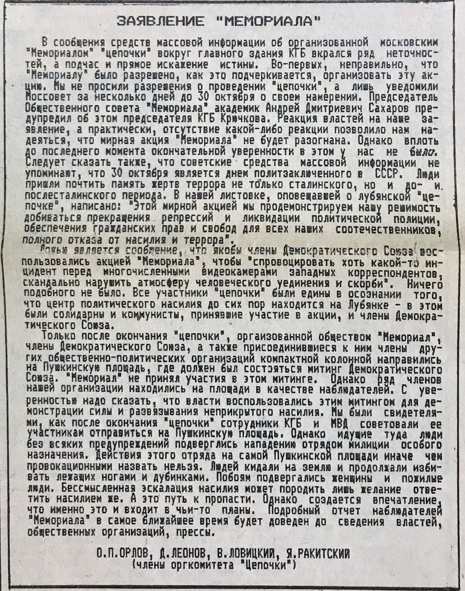 Из статьи Александра Добронравова «Лубянка, 30 октября», опубликованной в газете «Экспресс‐Хроника» 5 ноября 1989 года:
