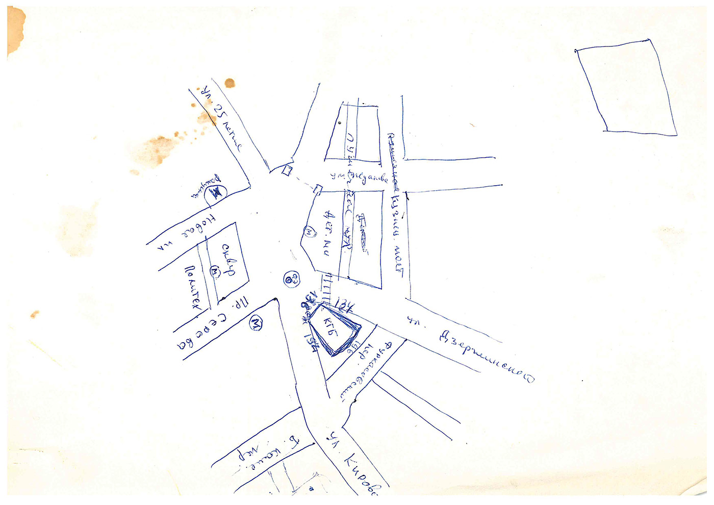 Карта улиц, прилегающих к зданию КГБ, нарисованная перед акцией. Архив Международного Мемориала