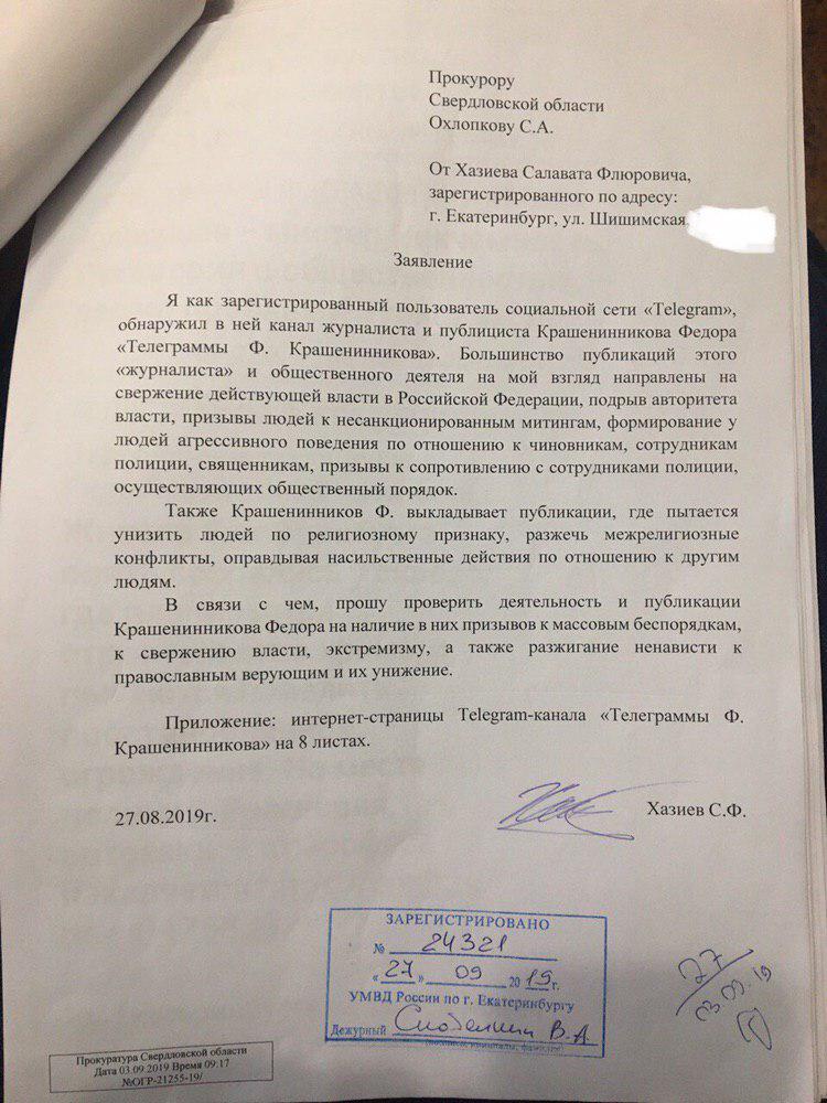 27 августа 2019 года в приемную прокурора Свердловской области С.А.Охлопкова пришел директор автосервиса «Апельсин» Салават Флюрович Хазиев и принес туда свое творчество — донос на меня, публициста и журналиста Федора Крашенинникова, текст можно увидеть на фотографии.