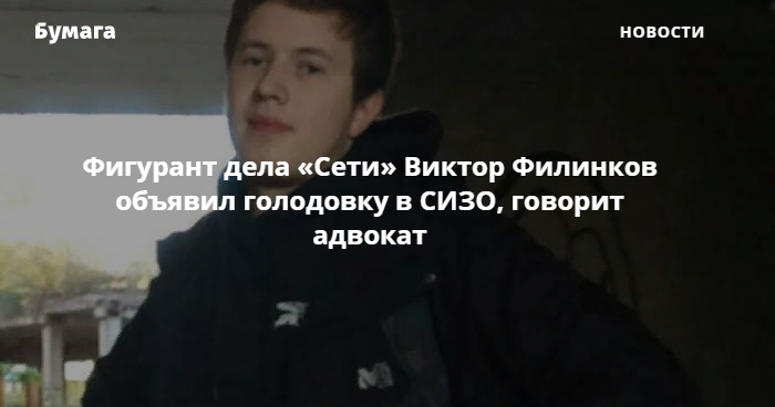 Фигурант дела «Сети» Виктор Филинков объявил голодовку в СИЗО. Об этом сообщает «МБХ медиа» со ссылкой на его адвоката Виталия Черкасова.