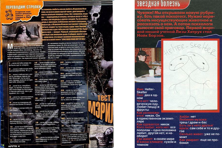 Журнал «КРУТО» вообще был настолько отлетевшим, что в его существование сегодня сложно поверить. Главными персонажами журнала были четыре мультяшных маскота — крутой рэпер Dr. Чел, панк по имени Хой, альтернативщица Тинка, которая «предпочитает облегающие наряды», и совершенно инфернальный плюшевый медведь по имени Пых Пох, который отвечал на чрезвычайно важные «письма» читателей. Например, помогал советом парню, который, проснувшись, обнаружил, что его рука «застряла на 30 сантиметров в глубине анального прохода». Совет, кстати, был весьма незатейливый — отгрызть руку и убить себя. Там же выходили статьи о том, как узнать характер девушки по её трусикам; тексты про фекалии и гениталии, а также великий тест «Ты гомик или педик?» от Мэрилина Мэнсона.