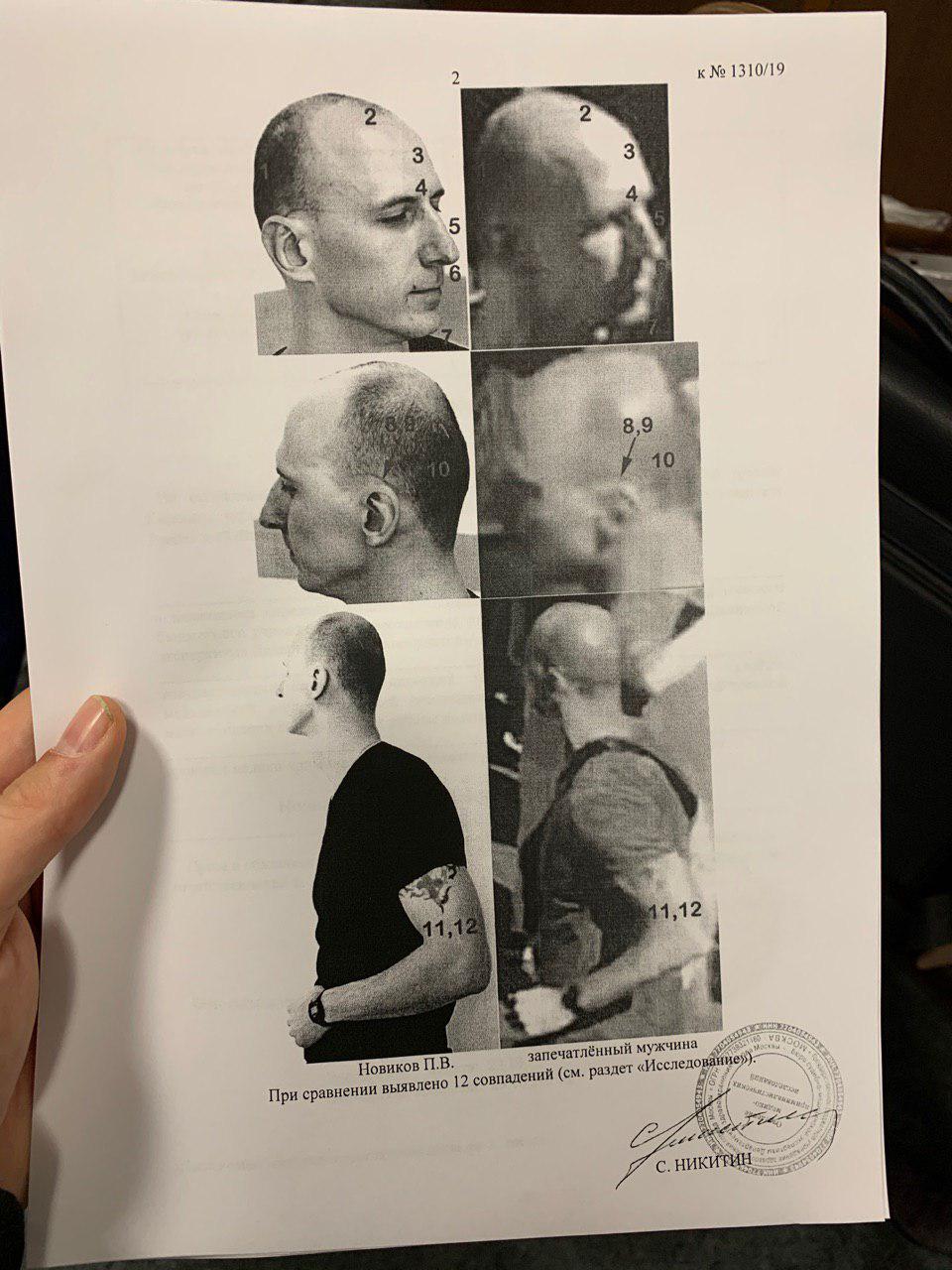 Исследование описано на одном листе (всего в заключении их три) — по 12 совпадающим признакам, в том числе татуировке. Эксперт приходит к выводу, что на видеозаписи, представленной следователем, запечатлен именно Павел Новиков. Кадры видеозаписи сравнивали с фотографиями Новикова, которые были сделаны в бюро. Время в заключении не уточняется, но вероятно, снимки сделали уже после задержания Новикова.
