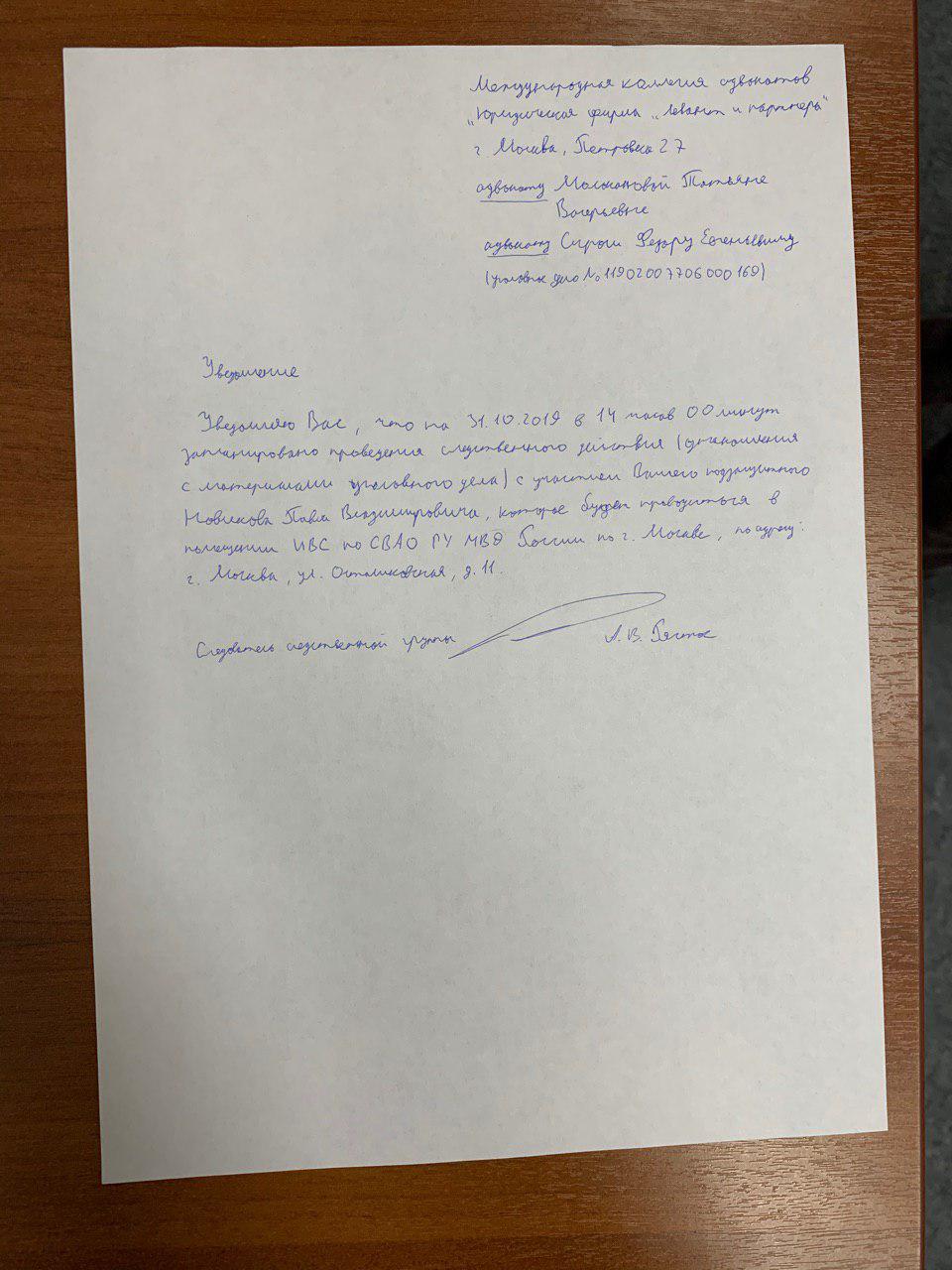 12:30‐12:45. Как следует из протокола допроса, только утром 30 октября в следственном кабинете ИВС Новикова допрашивают в качестве подозреваемого по части 1 статьи 318 УК (применение насилия в отношении представителя власти) в присутствии адвоката по назначению Артура Зотова. Адвокатам по соглашению из международной правозащитной группы «Агора», пытавшимся с 10:00 попасть к Новикову, не отвечали на вопросы о местонахождении их клиента. По версии следствия, в промежуток с 11 утра до трех часов дня у дома № 6 в Столешниковом переулке Новиков дважды ударил полицейского‐кинолога Алексея Широкого пластиковой бутылкой с жидкостью.