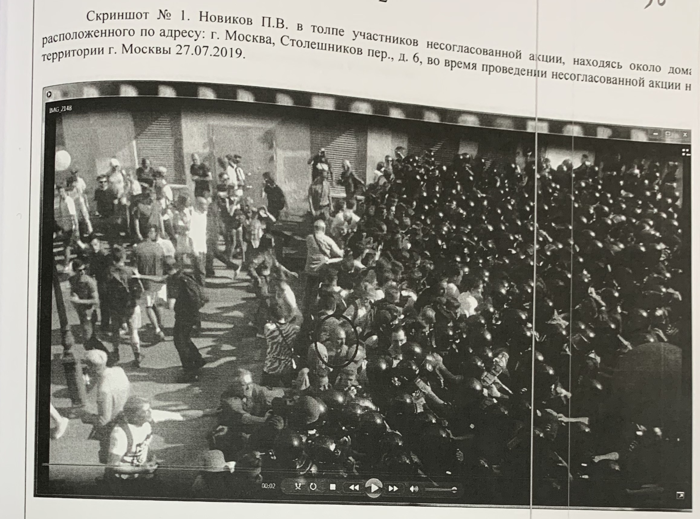 В рапорте оперативника отделения «И» 7‐го отдела Центра «Э» Д.И. Гребенчукова, на котором нет даты, говорится, что 32‐летний москвич Павел Новиков был одним из активных участников митинга 27 июля за допуск независимых кандидатов в Мосгордуму. «Новиков П.В. совершил противоправные действия в отношении сотрудников правоохранительных органов, нанеся несколько ударов сотруднику Росгвардии», — сказано в рапорте. К нему приложены скриншоты видеозаписи. Судя по ракурсу съемки, это не те кадры, которые позже покажет Следственный комитет.