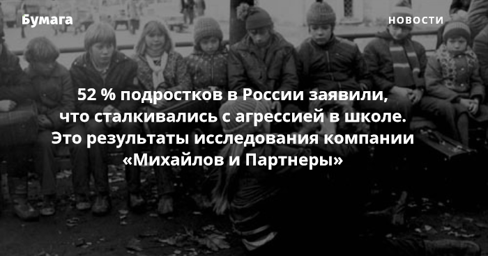 52 % опрошенных от 10 до 18 лет заявили, что сталкивались с агрессией в школе. По мнению подростков 16-18 лет, школьников чаще всего травят из-за внешнего вида или национальности. При этом 65 % участников исследования заявили, что в их школах «дружелюбная атмосфера».