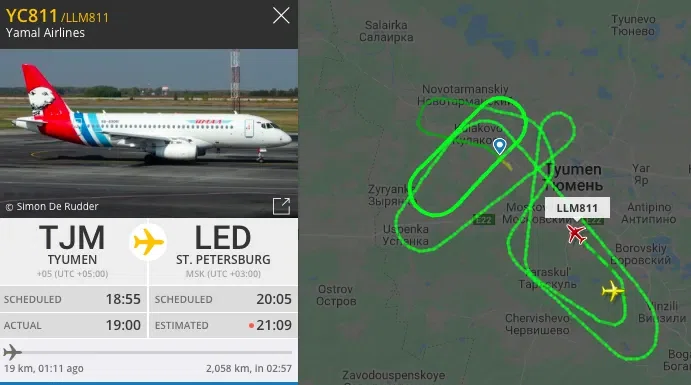 SSJ-100 выполнял рейс Тюмень — Санкт-Петербург, на борту находились 80 пассажиров и шестеро членов экипажа. По данным Интерфакса, вскоре после взлета у самолета возникли проблемы: левый двигатель работал с перебоями. Как выяснили в авиакомпании, двигатель отказал из-за того, что в него попала птица.