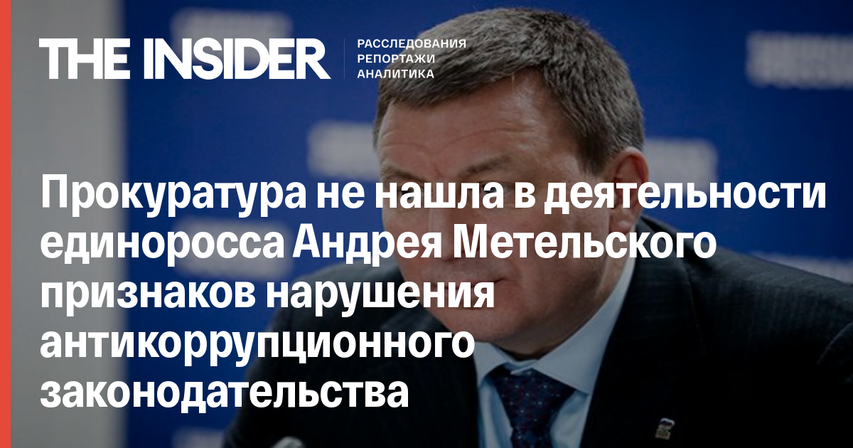 Московская прокуратура не нашла в деятельности единоросса Андрея Метельского признаков нарушения антикоррупционного законодательства. Об этом пишут «Ведомости» со ссылкой на ответ прокурора города депутату Госдумы Валерию Рашкину, который просил провести проверку.