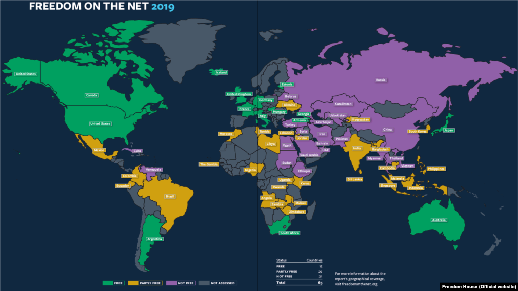 По мнению Freedom House, главным абьюзером свободы интернета в мире на сегодня является Китай (10 баллов), но страны СНГ мало отстают от него в перенимании этих практик. Без учета стран Балтии из стран бывшего СССР сегодня свобода интернета есть только в Армении (76 баллов) и Грузии (75 баллов), подчеркивают во Freedom House.