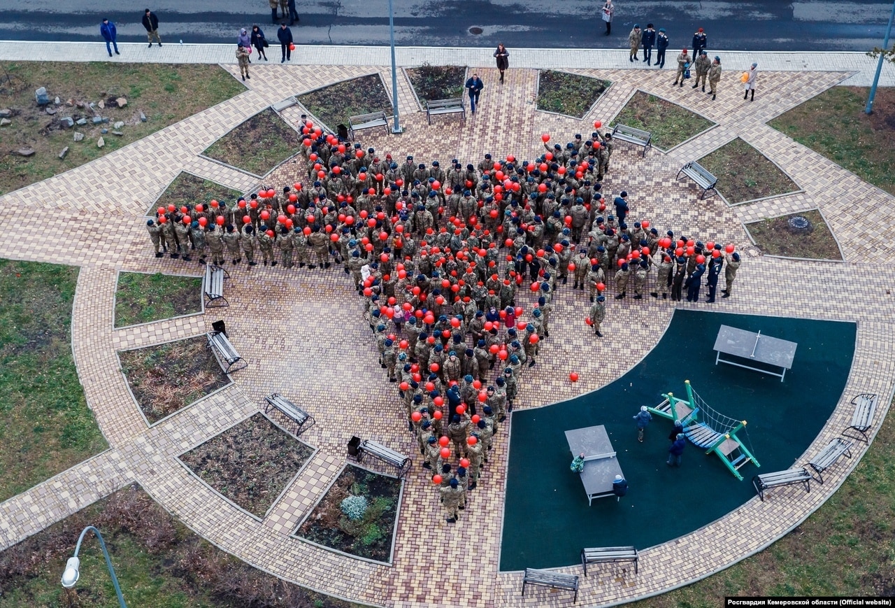А в Кемерове Росгвардия выстроила 400 сотрудников ведомства и школьников в пятиконечную звезду. В ведомстве сообщили, что дети сами предложили отметить таким образом День народного единства.
