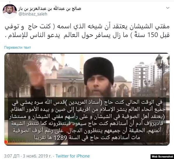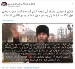 "Муфтий Чечни считает, что его шейх по имени Кунта-хаджи (умер 150 лет назад) до сих пор путешествует по миру, призывая людей к исламу", – подписал видео Салех ибн Баз.