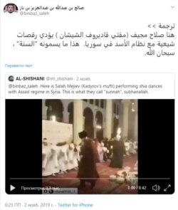 2 ноября Салех ибн Баз сделал репост видео, выложенного пользователем AL-SHISHANI, и перевел подпись автора: "Это Салах Межиев (муфтий Кадырова из Чечни), он исполняет шиитские танцы с режимом [президента Башара] Асада в Сирии. Вот это они называют 'сунной', Аллах пречист".