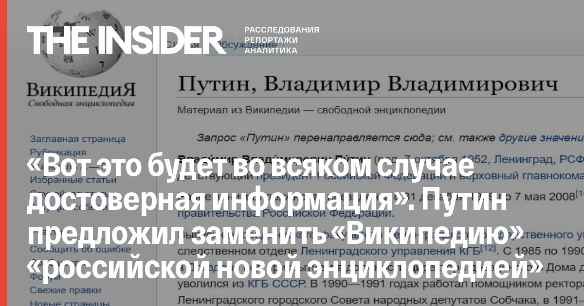 «По поводу «Википедии«... Лучше заменить ее Большой российской новой энциклопедией в электронном виде... Вот это будет во всяком случае достоверная информация, в хорошей современной форме предложенная», — сказал Путин на заседании Совета по русскому языку.