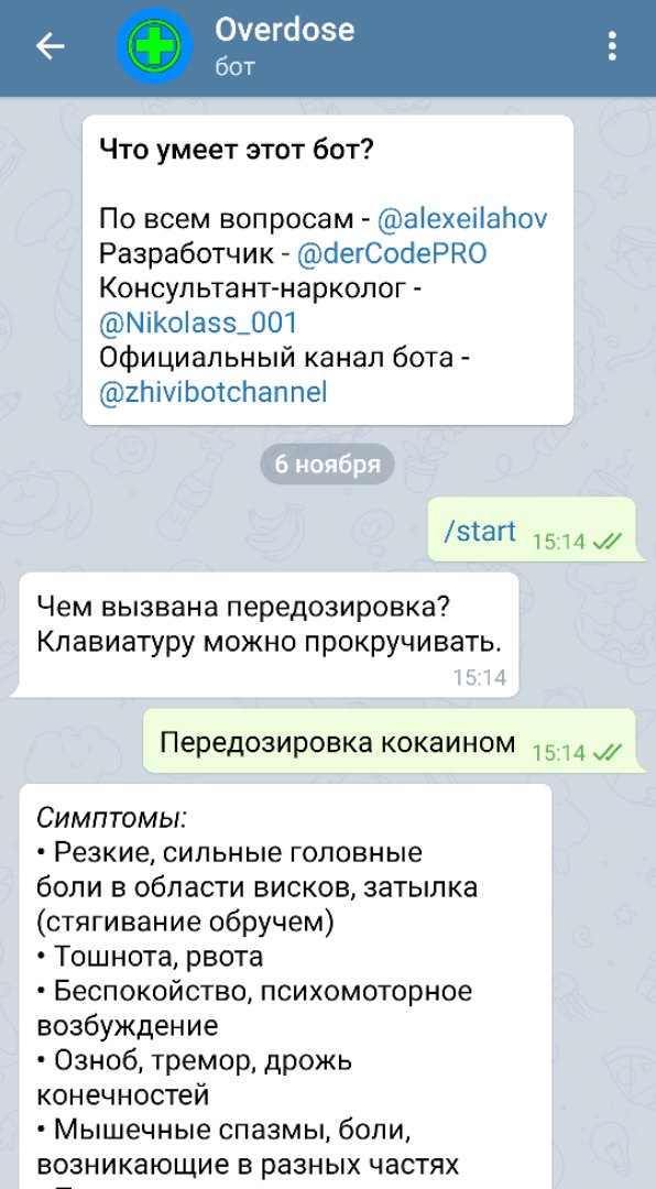 Бот рассказывает о симптомах передозировки опиатами, метамфетамином, марихуаной, галлюциногенными грибами и другими психоактивными веществами, а также присылает информацию о том, как оказать первую помощь.