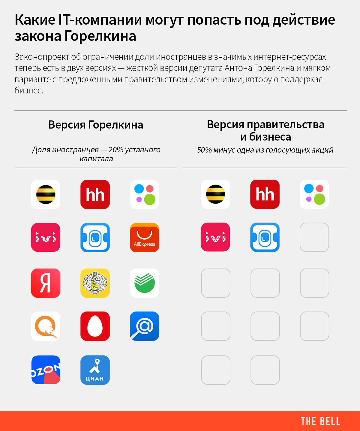 Что происходит. В этом году бизнесу удалось отбиться от немалого числа запретов — чего стоит хотя бы попытка Верховного суда снять срок давности с налоговых преступлений. Но не все запреты одинаковы. От предложенного депутатом Антоном Горелкиным и поддержанного администрацией президента ограничения на долю иностранцев в интернет-компаниях отбиться не удастся: законопроект будет принят, вопрос лишь — в каком виде, считают и чиновники, и представители IT-бизнеса, с которыми говорил The Bell.