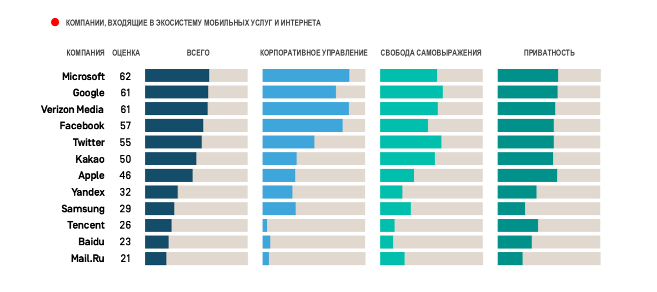 Не отставать от мировых тенденций стараются и российские интернет-компании. MailRu и Яндекс попытались укрепить свои позиции в «Индексе ответственности корпораций – 2019», который опубликовал в октябре проект «Рейтинг цифровых прав» (Ranking Digital Rights, RDR). Рейтинг показывает уровень прозрачности деятельности крупных мировых интернет-корпораций относительно прав и свобод пользователей. У большинства компаний наметился определенный прогресс, хотя работы еще предстоит много. Компания «Яндекс» поднялась на одну ступеньку выше в рейтинге по сравнению с прошлым годом. Mail.Ru тоже показала незначительный рост, но все равно оказалась в самом низу рейтинга. Эксперты отмечают, что она раскрывает меньше информации о своей корпоративной политике защиты прав пользователей.