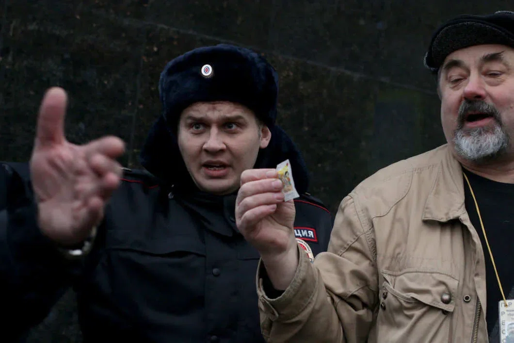 На пикет пришли также провокаторы из движения SERB Григорий Тарасевич и Игорь Брумель. Они пытались помешать проведению одиночного пикета и заставить полицию задержать его участников.