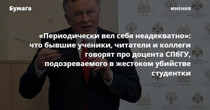 — Доцент Соколов преподавал у меня. Периодически вел себя неадекватно. Я писал письмо в СПбГУ с просьбой отстранить Соколова от преподавания. А сегодня он расчленил свою бывшую студентку и пытался спрятать в Фонтанке (в Мойке — прим. «Бумаги»). Похоже, что убитая — моя однокурсница. П…ц.