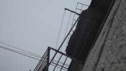 Выглядываем в окно – над балконом пятого этажа, по диагонали от квартиры Натальи Фадеевой, навис огромный кусок бетонной плиты. Откололся он во время взрывов, так до сих пор и висит.