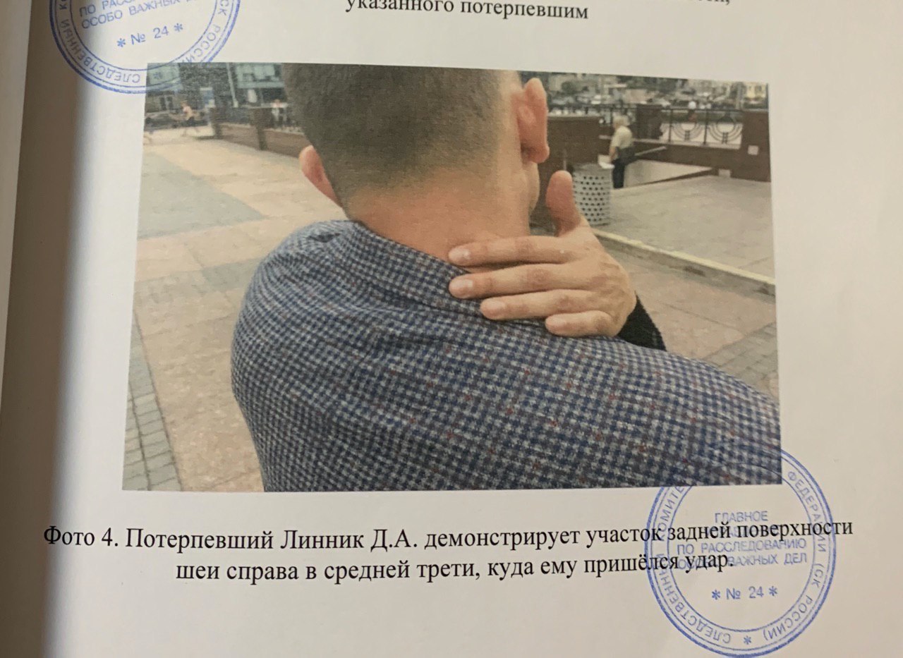 1 сентября — 2 сентября. Следственный комитет повторно допрашивает потерпевшего и его коллег. Линник повторяет то, что говорил раньше, и уточняет, что в брошенной бутылке была жидкость. Во время проверки показаний на месте он настаивает: «Уверен, что именно ударом бутылки, брошенной из толпы, мне была причинена боль». В материалах дела это проиллюстрировано фотографией: стоя на Трубной площади спиной к камере, полицейский показывает, куда именно пришелся удар.