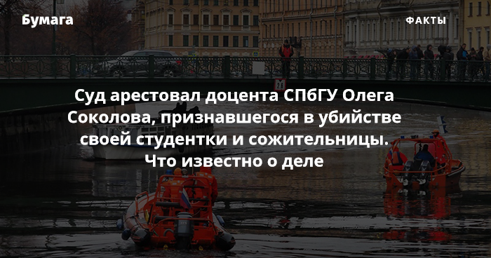 В Петербурге 9 ноября из Мойки спасли доцента СПбГУ Олега Соколова, в рюкзаке которого обнаружили отрезанные женские руки и травматический пистолет. Позже в квартире историка нашли пилу и тело 24-летней аспирантки и сожительницы Соколова Анастасии Ещенко. Ученый признался в убийстве девушки, его заключили под стражу до 8 января 2020 года. «Бумага» рассказывает, что известно о деле.