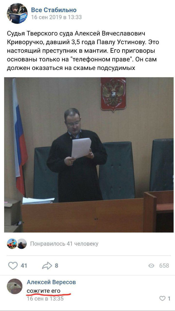 В телеграм-канале опубликован комментарий Вересова: он написал 16 сентября "сожгите его" под новостью в ВК-паблике "Все стабильно" о том, что судья Тверского райсуда Москвы Алексей Криворучко назначил 3,5 года общего режима фигуранту "московского дела" Павлу Устинову. В связи с этим неясно, почему в СКР заявляют об угрозах судье МГС, а не Тверского райсуда.
