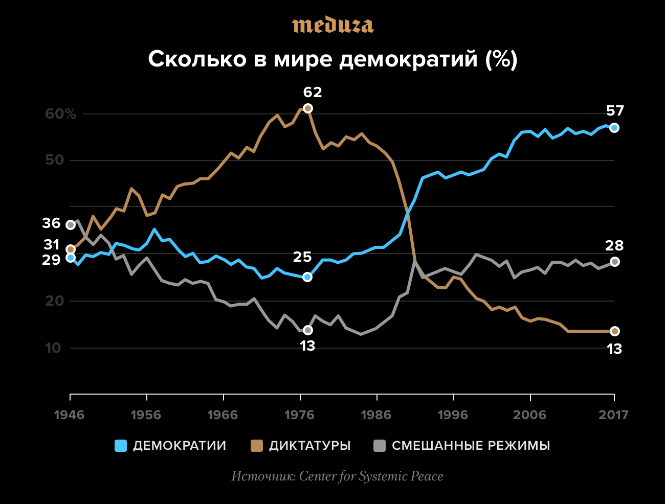 По оценкам ведущего американского исследовательского центра Pew, число демократий в мире с 1977 года увеличилось в несколько раз (учитывались только страны с населением больше 500 тысяч человек). 40 лет назад авторитарных государств было 89 (62%), а демократических — 35 (24%). К 2017 году все изменилось: в мире стало 96 демократий (57%) и 21 диктатура (13%). Правда, это небольшое снижение по сравнению с 2016 годом, когда был достигнут абсолютный рекорд по проценту демократий — 58%.