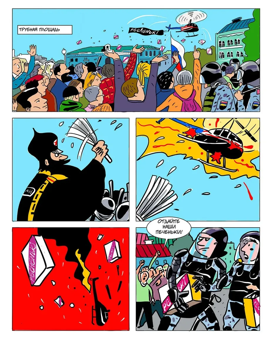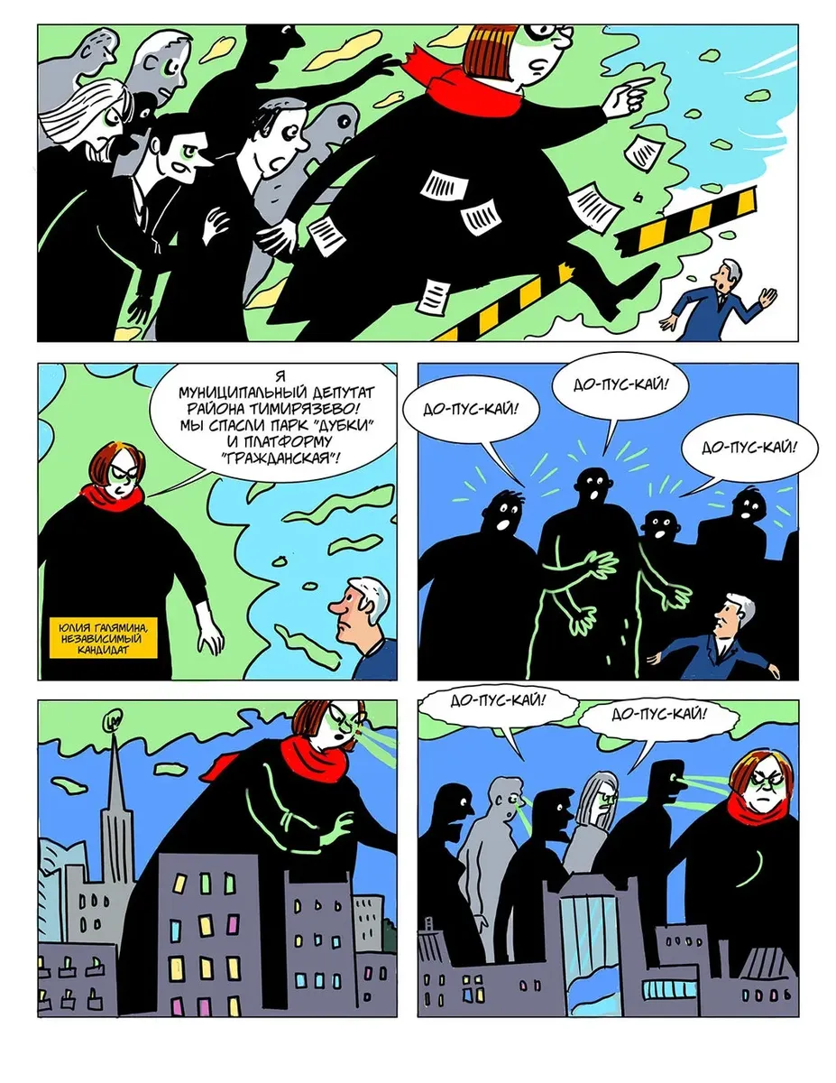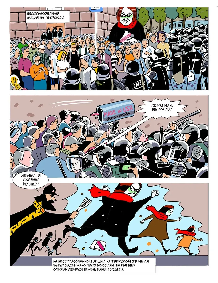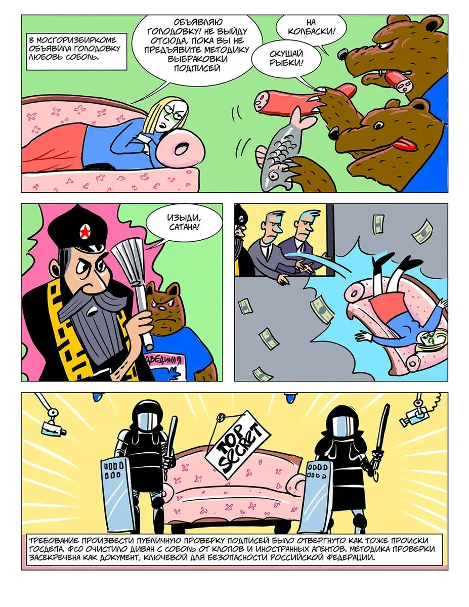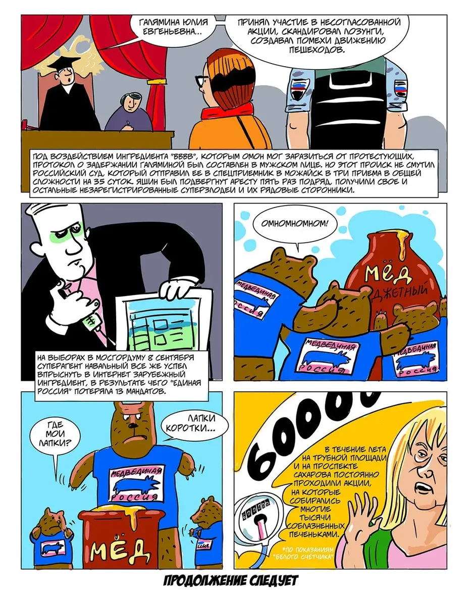 С прошлого мая, когда вышел последний судебный комикс, обстановка угрожающе изменилась. Отечество в опасности! Неоперившаяся молодежь, подстрекаемая Госдепом и западными фондами, тут и там замышляет массовые беспорядки, грозящие перерасти в «майдан»: в столице рвались к власти незарегистрированные кандидаты в Мосгордуму, несанкционированные митинги вытоптали цветы возле администрации президента, в Ингушетии избили росгвардейцев, в Санкт-Петербурге и Перми ужасная «Сеть» разливает «коктейли Молотова», жители Архангельской области создали в Шиесе коммуну с целью завалить отходами Москву, журналистка Светлана Прокопьева из Пскова пропагандирует терроризм, подверженные контактам с Западом физики и химики продают иностранным разведкам военные секреты, страшные «Новое величие» и сайт в Ростове создают тайные общества с целью свержения законной власти — всех угроз не перечесть.