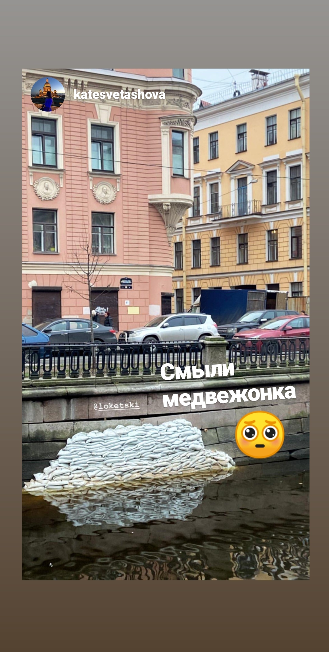 Петербуржцы шутят над горой мешков, а художник Loketski представил ее сугробом в стрит-арте с медвежонком Умкой. «Бумага» рассказывает, что происходит с подмывом на набережной канала Грибоедова и как на происходящее реагируют горожане.