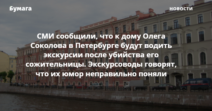 В соцсетях проекта с авторскими экскурсиями «Ползком по Питеру» заявили, что не будут водить водить экскурсии к дому историка Олега Соколова, сознавшегося в жестоком убийстве аспирантки. В проекте утверждают, что журналисты неправильно поняли организатора маршрутов Сергея Гончарова и вырвали его слова из контекста. Ранее о якобы планах организации включить дом доцента на набережной Мойки, 82 в экскурсионный маршрут написало несколько СМИ.