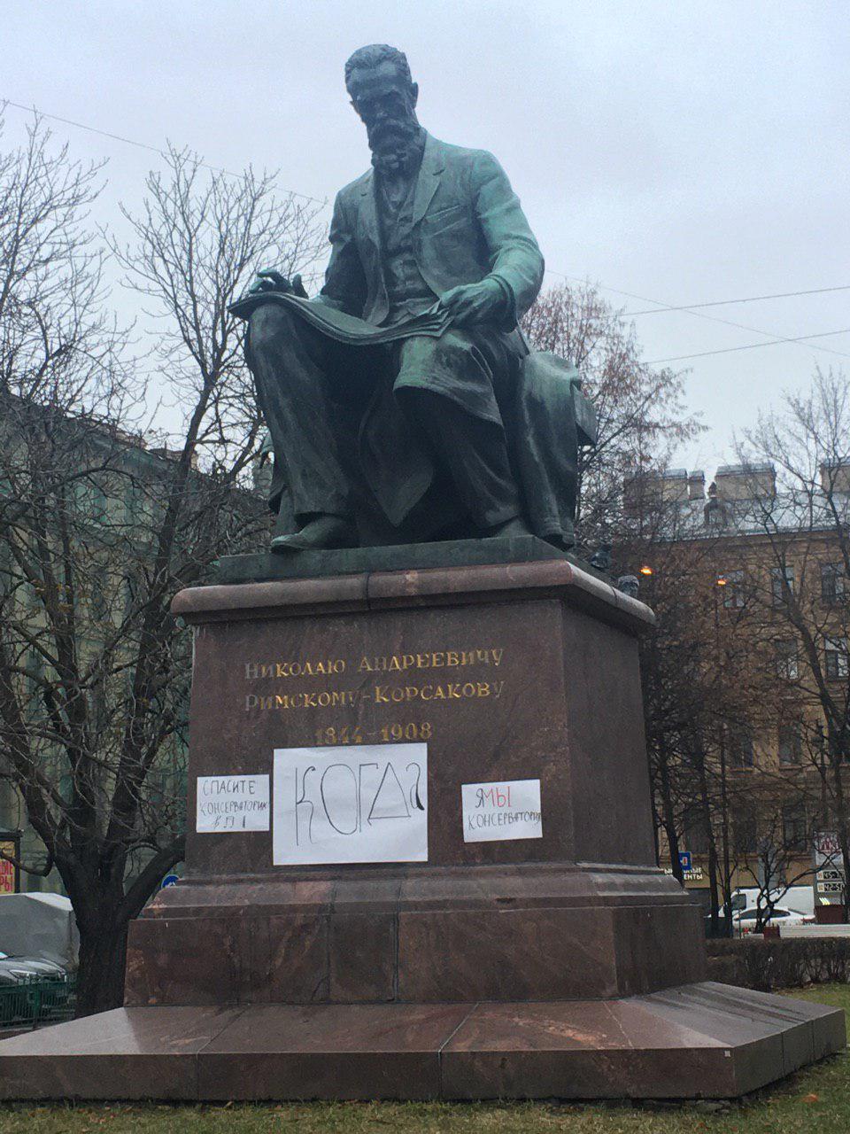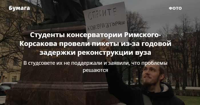 Днем 14 ноября у памятника Римского-Корсакова на Театральной площади прошли пикеты, в которых участвовали студенты и выпускники вуза, сообщили «Бумаге» участники акции. До этого в студсовете заявили, что не поддерживают идею проведения пикетов и что руководство консерватории пытается решить проблему.