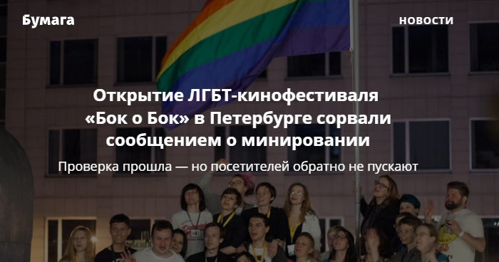 Вечером 14 ноября отель Sokos в Биржевом переулке, в котором должно было состояться открытие ЛГБТ-кинофестиваля «Бок о Бок», эвакуировали из-за звонка о минировании. После часовой проверки здания гостям отеля разрешили вернуться в номера. Но посетителей и организаторов фестиваля не пускают в помещение, где должно проходить мероприятие. Об этом «Бумаге» сообщила участница оргкомитета фестиваля Гуля Султанова.