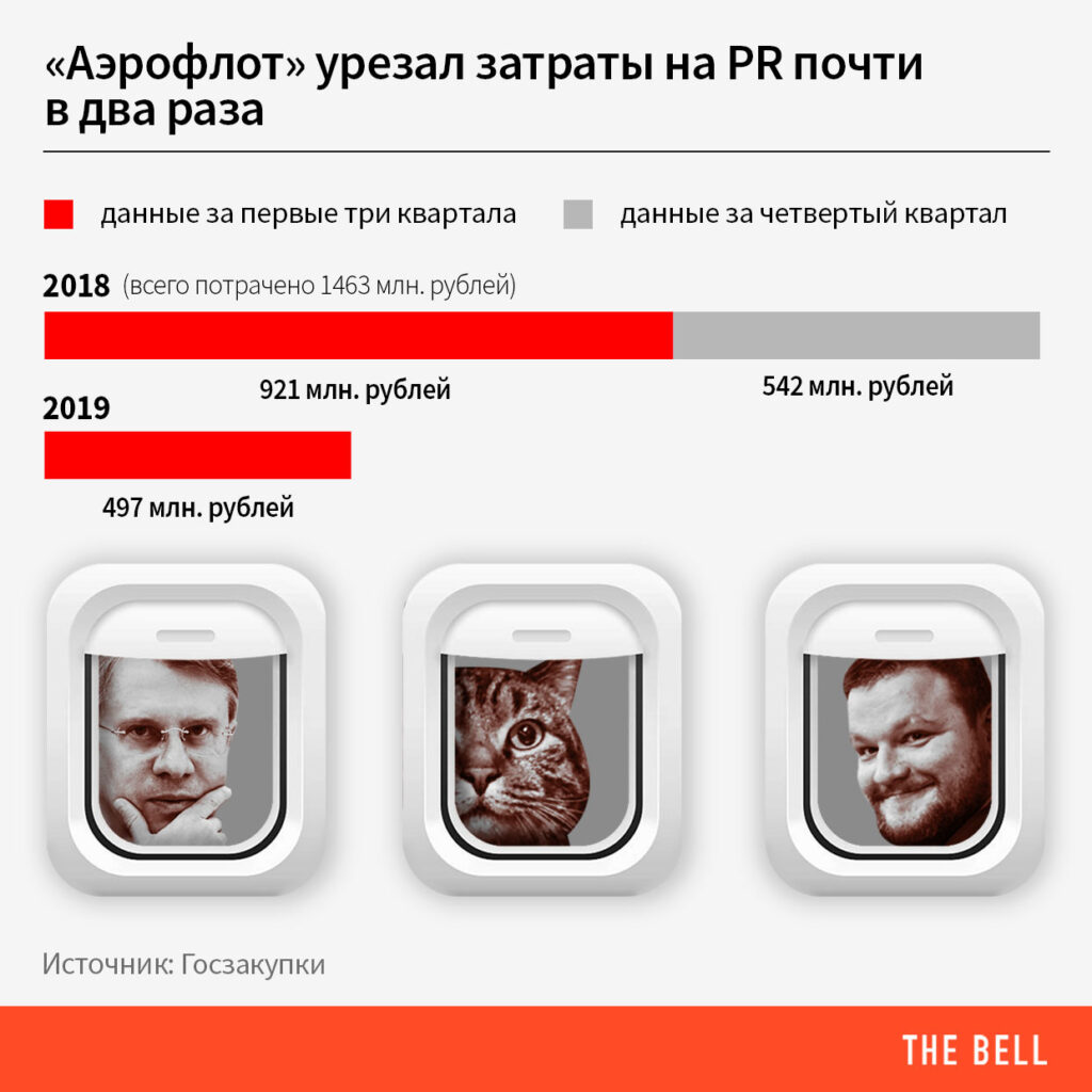Что случилось. Бюджет «Аэрофлота» на PR в 2019 году сократился примерно вдвое, выяснил The Bell, изучив данные госзакупок. Это подтвердил источник, знакомый с ситуацией в компании, добавив, что сократился и рекламный бюджет. За 9 месяцев 2019 года компания заключила контракты на продвижение в СМИ и соцсетях на 491 млн рублей, за тот же период 2018-го — 921 млн. За весь 2018 год эта сумма составила 1,46 млрд рублей.