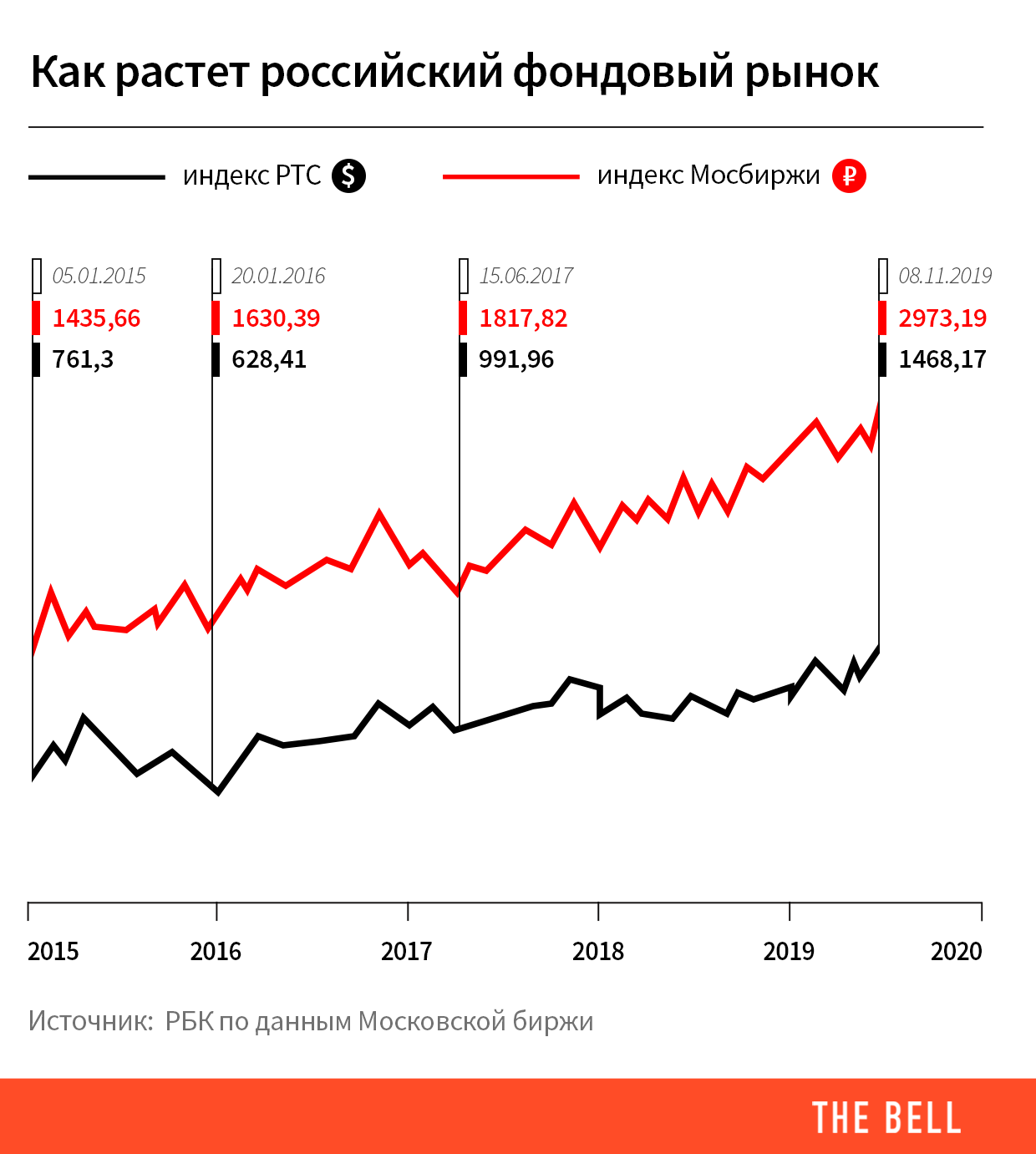 Из-за обесценивания рубля индекс РТС (рассчитывается почти так же, как индекс Мосбиржи, но в долларах) лучше отражает ситуацию в экономике, добавляет Смирнова. Он учитывает обесценивание рубля к доллару, а значит, более точно показывает, на какие товары с иностранной составляющей и траты за рубежом может хватить заработанных денег.