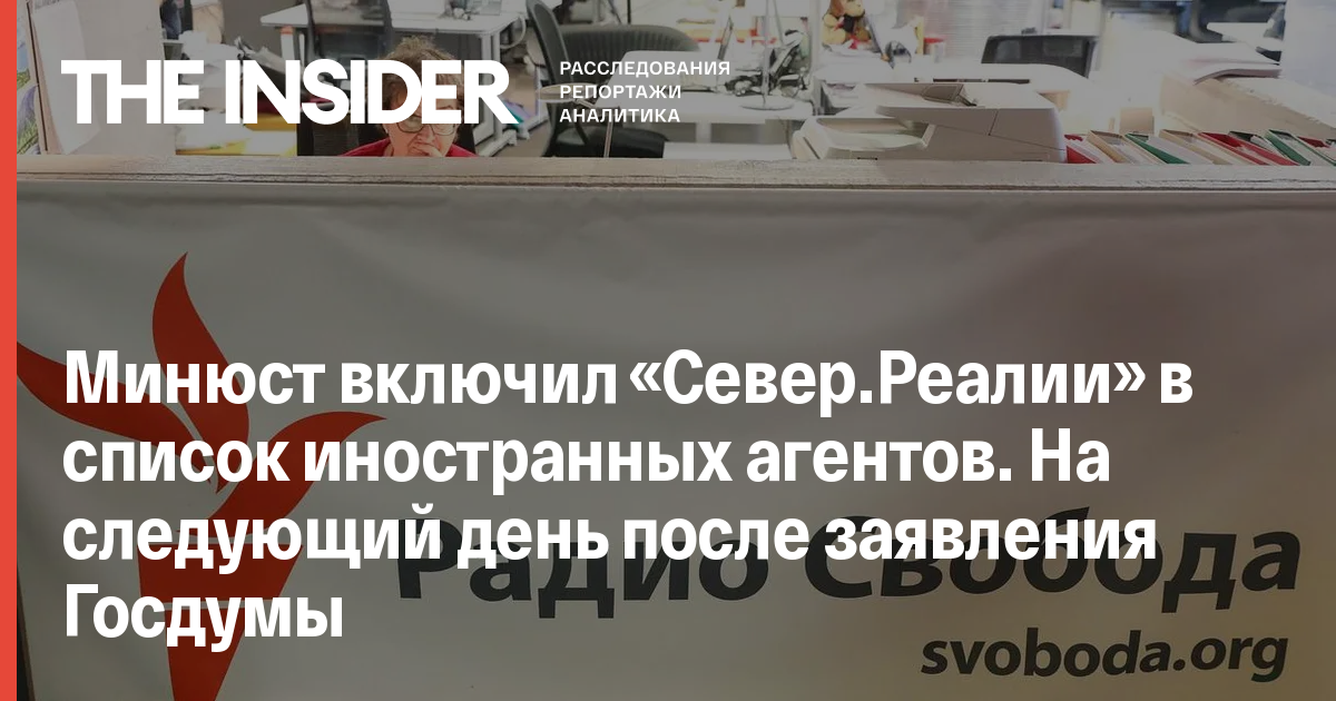 Минюст включил «Север.Реалии» в список иностранных агентов. На следующий день после заявления Госдумы