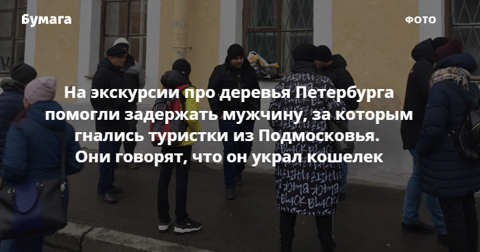 Днем 16 ноября прохожие и участники экскурсии от проекта «ЭкоЧашка» задержали мужчину, за которым гнались туристки из Подмосковья. По их словам, этот мужчина украл кошелек у одной из них на Невском проспекте. Впоследствии задержанного передали полиции. Об этом сообщила корреспондентка «Бумаги», ставшая свидетельницей происшествия.